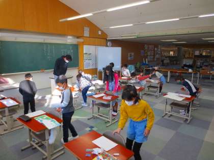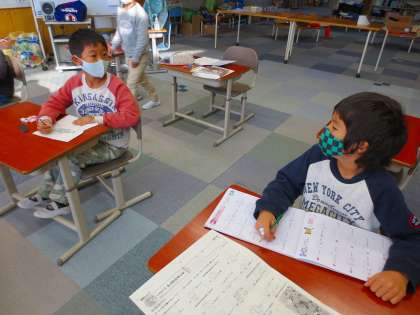 「顔も描いてあげてね」と頼むと、「私は顔は苦手だから、△△くん、代わりに描いて」ということで、別の児童が描いています。上手いですね。