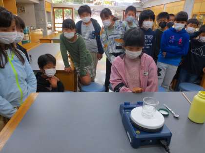 物の溶け方の実験ですね。順番に見に来たり、粒を入れたりしています。