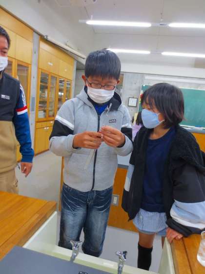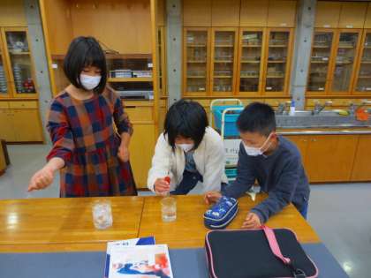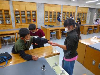 「物の体積と温度」の実験です。今回は空気が膨張したり、縮んだりすることを目でわかるようにして、確かめているところです。
