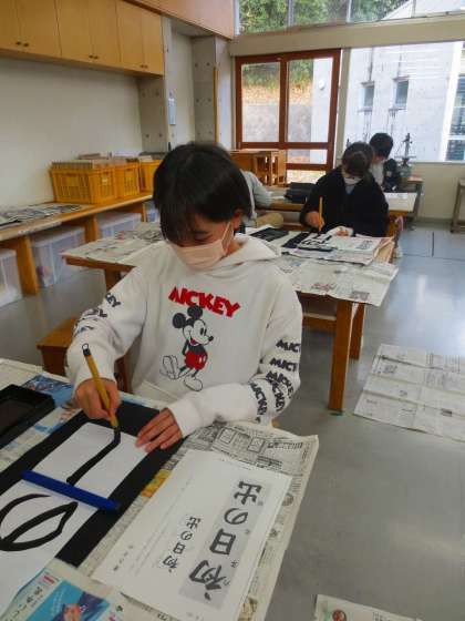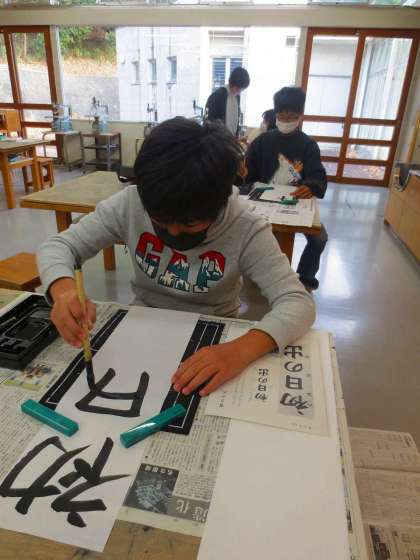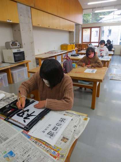 年賀状を書き終えた児童は、おやおや書き初めを書いています。