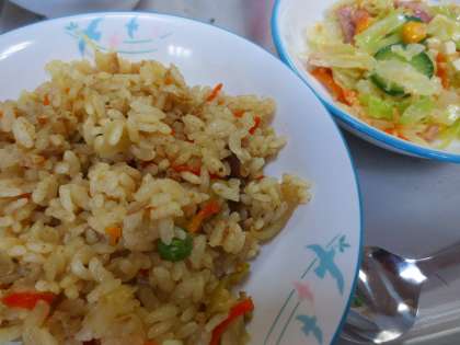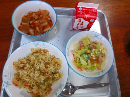 金曜日は炊き込みご飯のメニューが多いです。今日はピラフです。