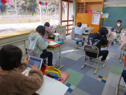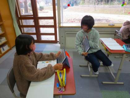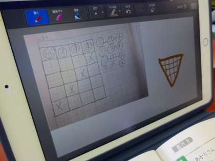 6年生の算数ですが、ちょっと面白い活動でしたので紹介します。ある問題をノートで解いているのですが、それをタブレットで撮影したり、加工したりしています。実はその画像は他人のタブレットからも見ることができます。実際にグループにならなくても画像転送で見合うことができるのです。