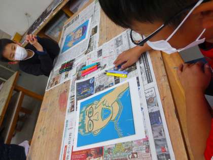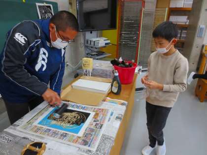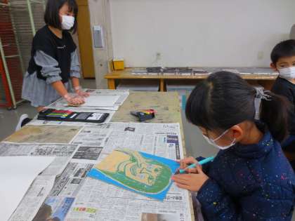 4年生も刷りの段階となりました。彫っている顔と本人がとても似ているので、どうも自画像のようですよ。