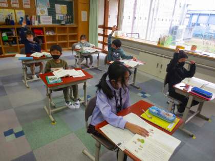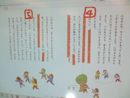 文章の読み取りです。大型画面に提示された教科書です。それを利用しながら読み解き、意見を求めています。あまり挙手がない時は「まぢかえてもいいから、考えたことを言おうよ」と児童自ら発していました。いい声がけですね。