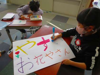 グループごとにお見せを出すそうです。そのための準備ですね。「やすい お花やさん」と書いてあり、紙に書いてある商品もお値打ちの価格でしたので、「1億円にすればいいのに」と言うと「そんな高いのはいかん」と叱られました。つづく・・