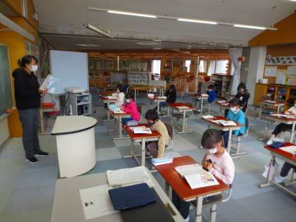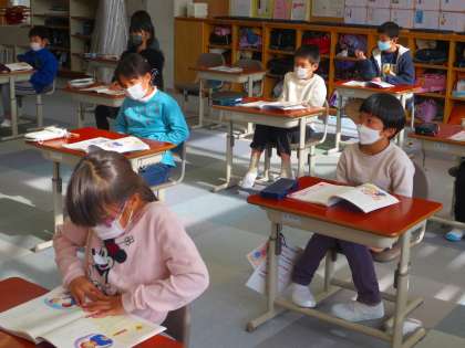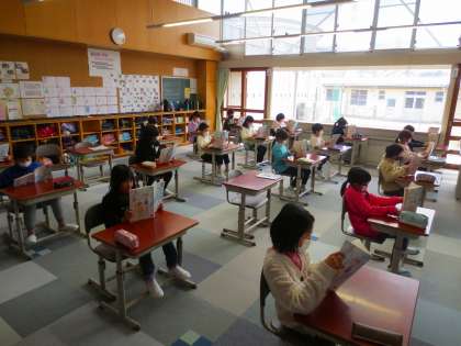 音読の時はきちんと本を手に持っています。ちなみに3年生は給食の時もとても静かに上手に食べています。学校生活がとても落ち着いていますよ。