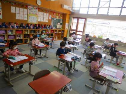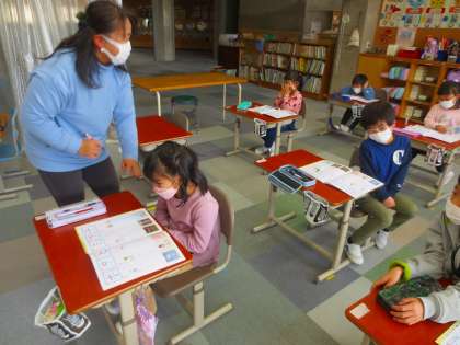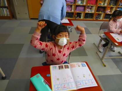 カタカナの練習になりました。正しく書けると花まるがもらえるそうで、もらえるとみんな歓声をあげたり、ガッツポーズをしています。