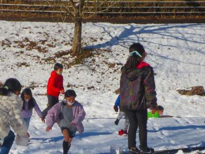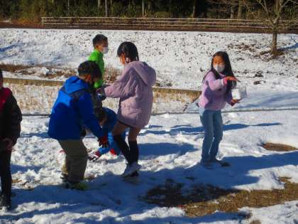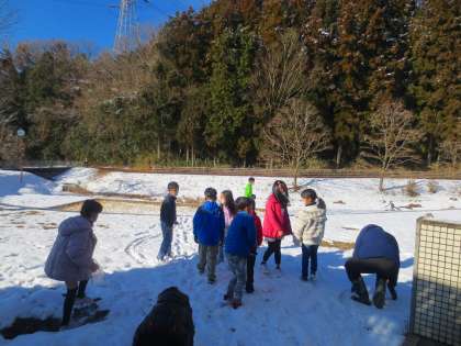雪合戦かなぁと思っていましたか゛、2年生も容器に雪を集めていました。最初はこじんまりとまとまっていましたが、次第に遠くまで行くようになり、「先生〜、井戸が凍っている!」といろんな発見をしていました。