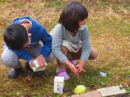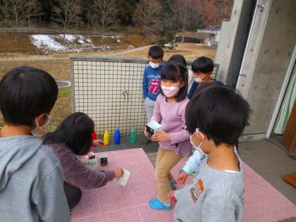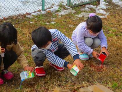 昨日、雪に色水を混ぜていた続きですね。一晩経ってどうなっているでしょうか。