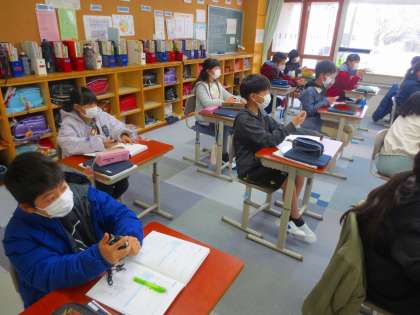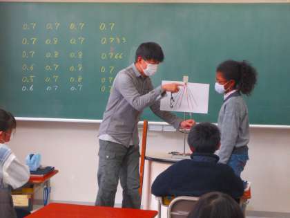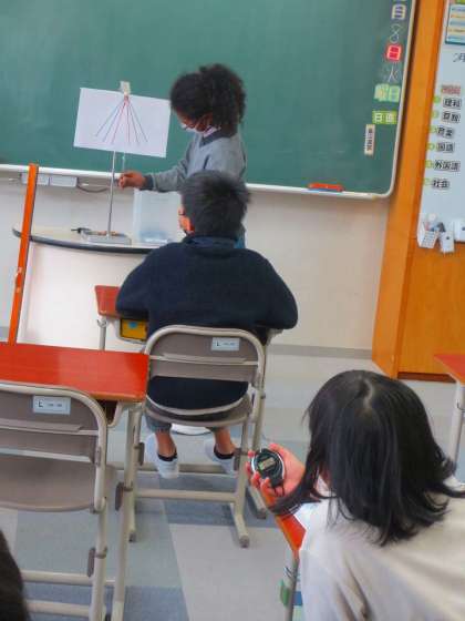 ふりこの実験です。一人ずつストップウォッチを持って計測しています。