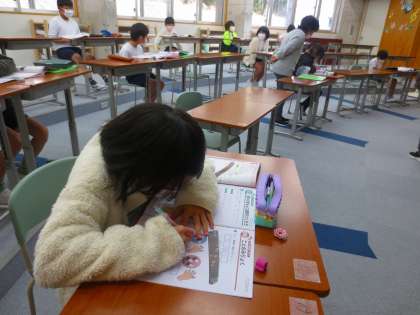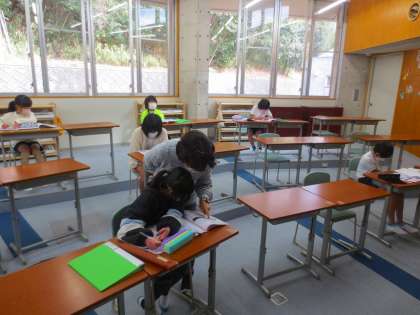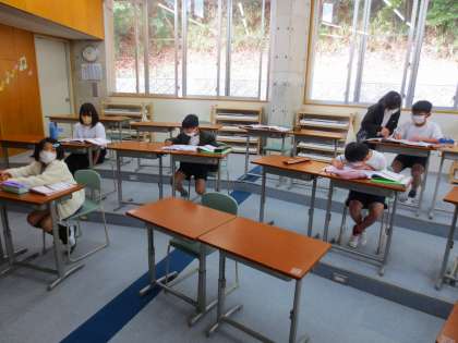 音楽鑑賞をしていました。このあとは電子ピアノをやるそうです。感染防止のため、合唱やリコーダーの演奏をやめています。
