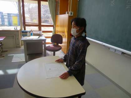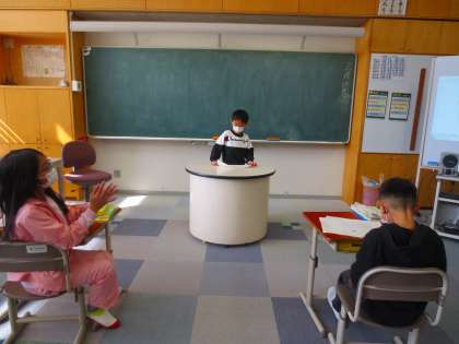 全員の前で原稿用紙に書いた文章を読んでいます。