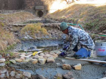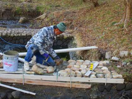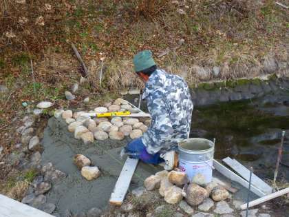 水が流れる所なので、水平をきちんと測ります。またぼろぼろになったモルタルを撤去して地盤を固めます。それから基礎コンクリートをいれるので、コンクリートを作っては運び、そして流してならすを延々と繰り返しました。
