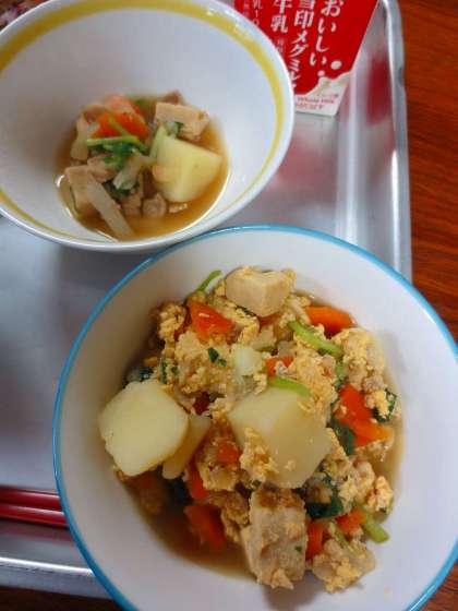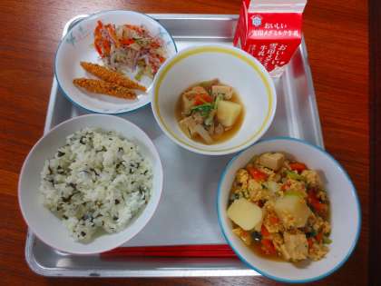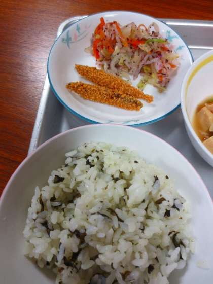 今日の給食は和風ですね。高野豆腐の卵とじ、魚のカリカリ揚げ、わかめごはんです。