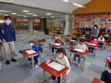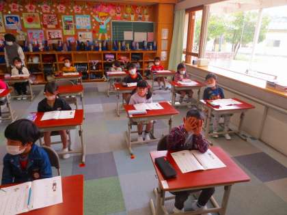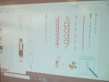 書写というより、鉛筆に慣れる段階の授業でした。一つ一つ担任の指示で線を引いたり、文字を書いたりしています。