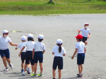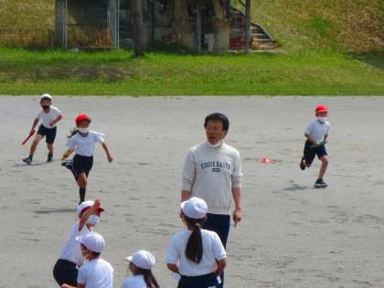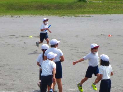 リレーですが、即席のチームなので上手にバトンパスができません。これからどんどん練習しましょうね。