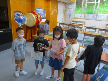 図工室では4年生が毛筆をやっているので、とても興味津々に見つめていました。