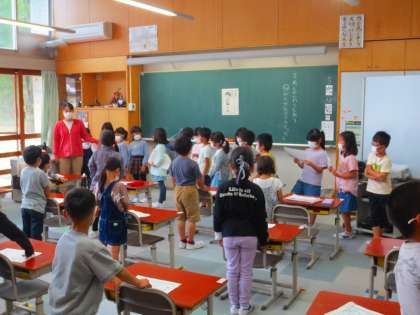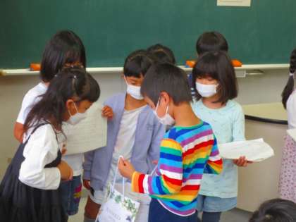 学校たんけんの最後は、教室で2年生から1年生へのプレゼントです。
