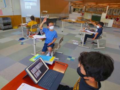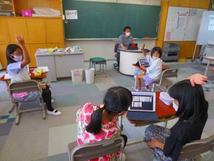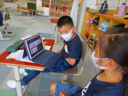 再び3年生を訪問。タブレットだ他の児童の考えを見て、話し合っています。席に座りながらも他人のノートが見られるので便利ですね。
