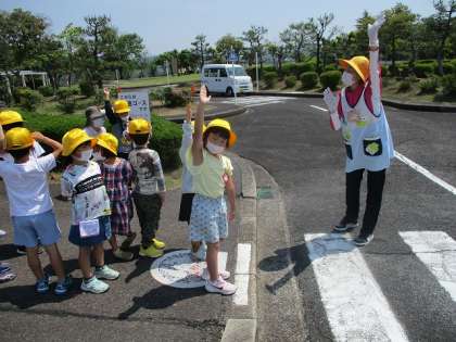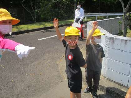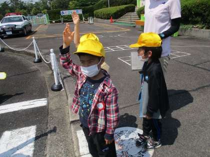 1年生は初めての校外学習です。とても良いお天気で、すこし暑すぎるぐらいでしたが、みんながんばって交通ルールを学んできました。手のあげ方、横断歩道の渡り方など、丁寧に教えていただき、最後はパトカーの前で記念撮影をしました。