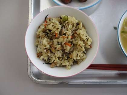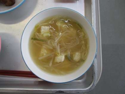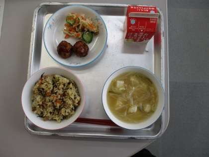 今日のメニューは、中華ひじきごはん、春雨のスープ、肉団子、切り干し大根の中華サラダ、牛乳です。