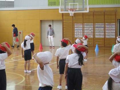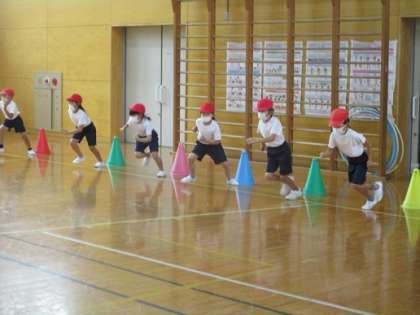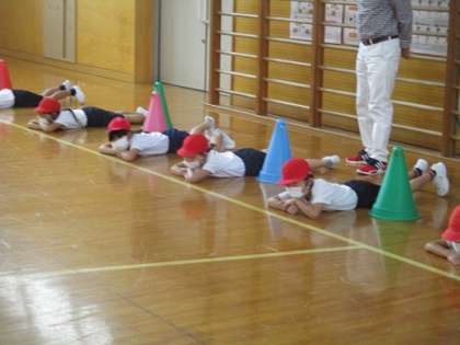 走の運動遊びに取り組んでいます。いろいろな姿勢からスタートして走る練習をしています。
