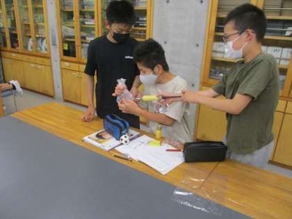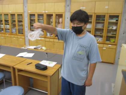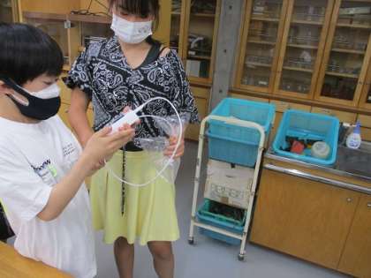 吸う空気とはく空気についての実験を行っています。ビニール袋に息を吹き込んで、石灰水、酸素センサー、気体検知管ではき出した空気と吸う空気の違いを調べています。