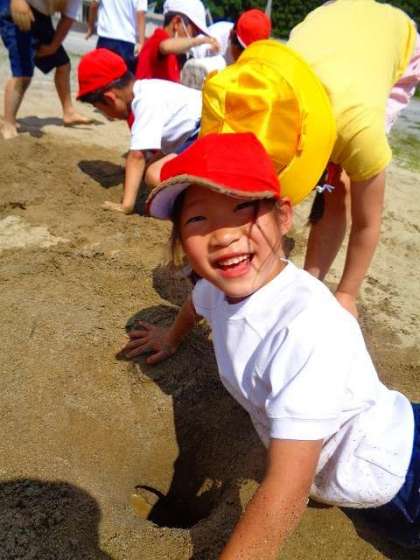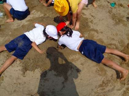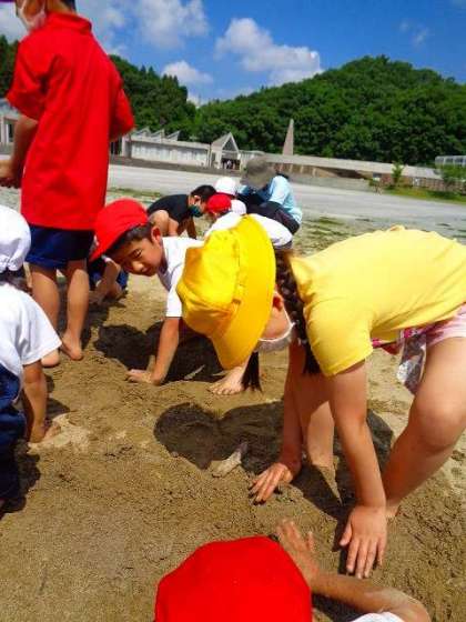 1年生は砂場で遊びました。自分の腕がすっぽり入るような穴をあけていてビックリです。
