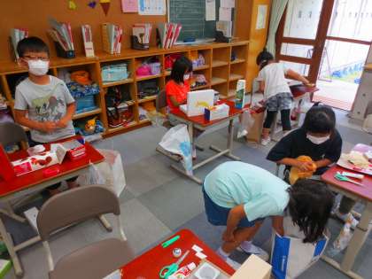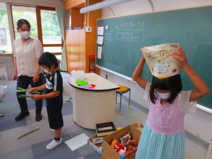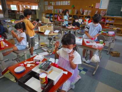 紙の箱を題材に、「ともだちハウス」を作っていました。みんなウキウキと作っています。