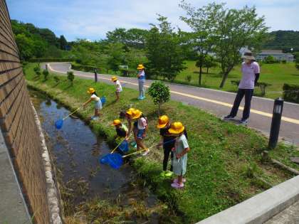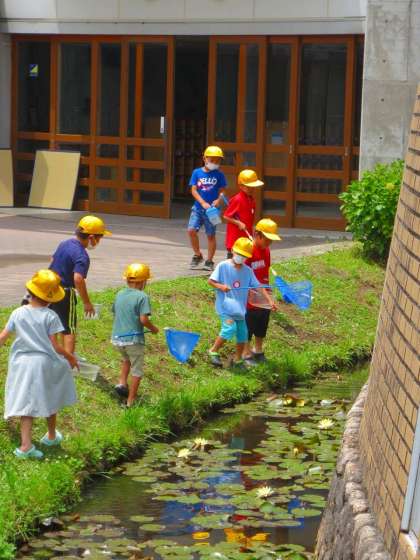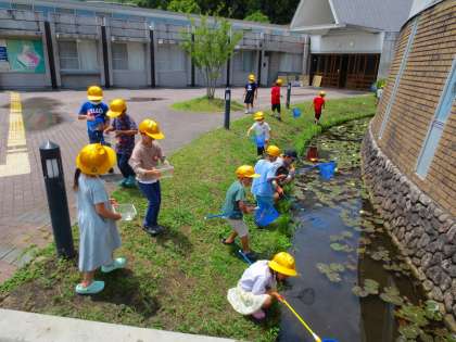 せせらぎで水中生物を捕まえます。