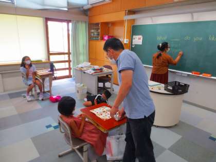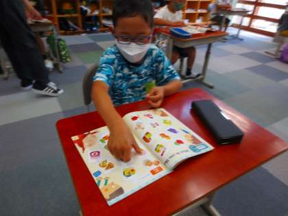 教科書に並んでいる多くのイラストを見て、その中から5つ選びなさいという課題に取り組んでいます。でもこれは英語の授業です。どんな会話がなされたのでしょうね。