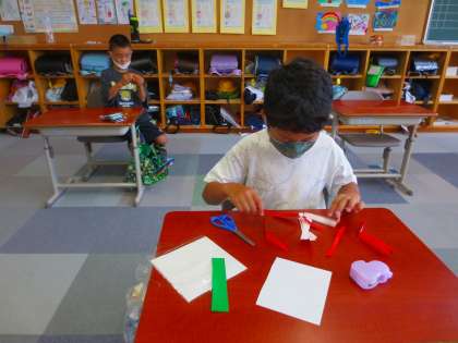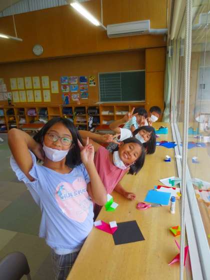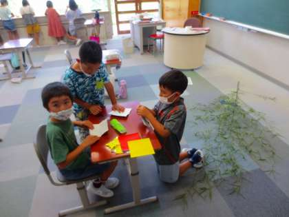 3年生はまさに七夕かざりを作成中でした。クラスで1本の竹に飾るようです。