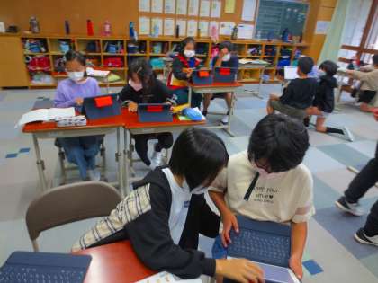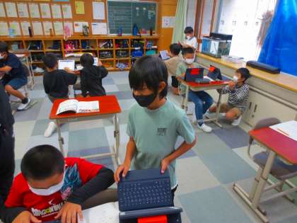 タブレットで調べています。一人調べはよく見るのですが、ペアで調べ学習をしているのは珍しいです。情報交換をしつつ、検索するというのもとてもいいですね。