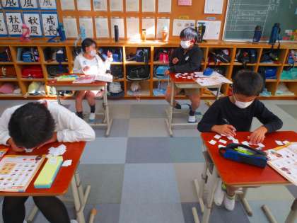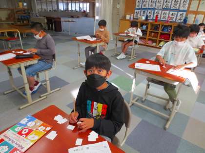 学習に使うカード一枚ずつに名前をローマ字で書いていました。それなりに大変そうです。