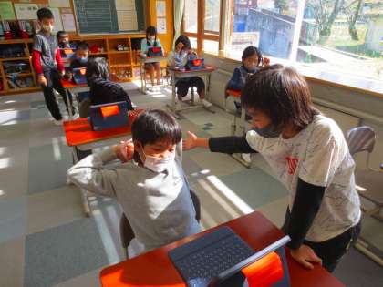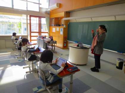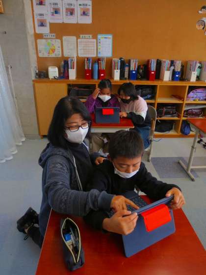 一人一台のタブレットをよりよく活用するために、瀬戸市では支援員を配置しています。今日はその支援員が本校に来る日になので、4年生では支援員さんの指示に従い、新しい機能を学習しています。