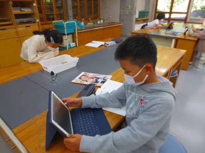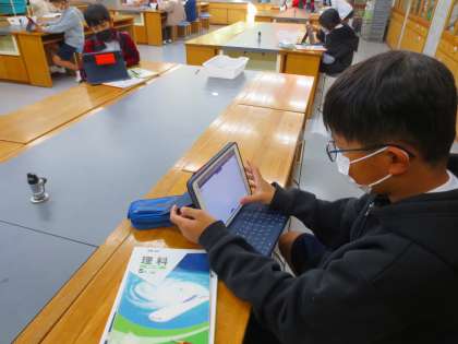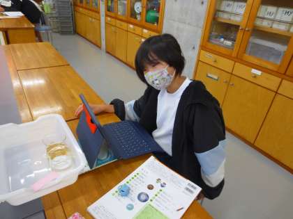 塩が溶けた水を蒸発させたようすをタブレットで撮影し、記録しています。