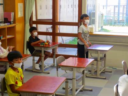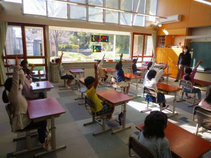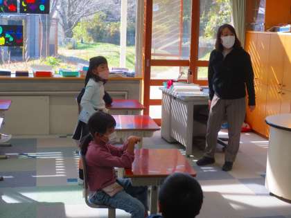 教室から元気な声が聞こえてきました。たぶん英語かなと思って教室に行くと、やっぱり英語です。ALTは子どもたちをのせるのがとても上手です。