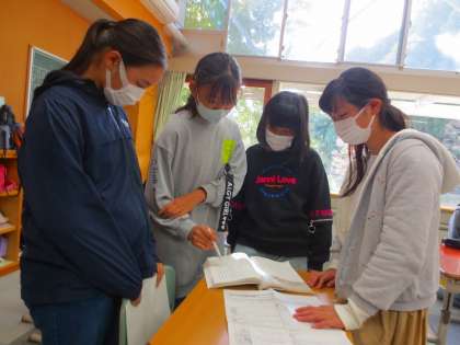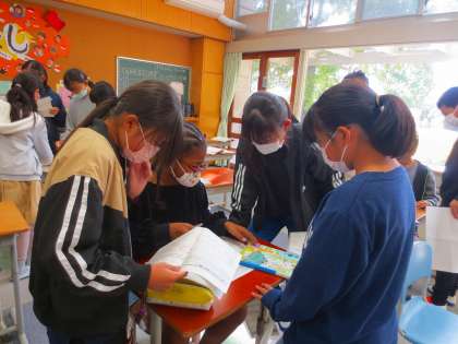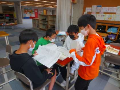 「鳥獣戯画」の単元です。自分で考えたプリントをグループで持ち寄り、話し合っています。