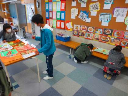 鑑賞の時間です。作ったり描いたりするだけでなく、見ることも大切な感性ですね。