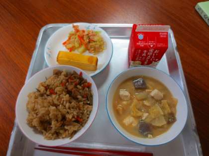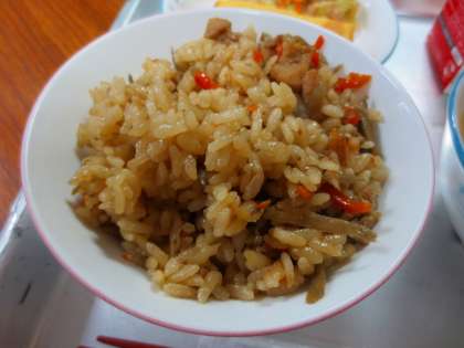 とり五目飯、卵焼きなどです。