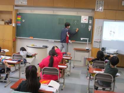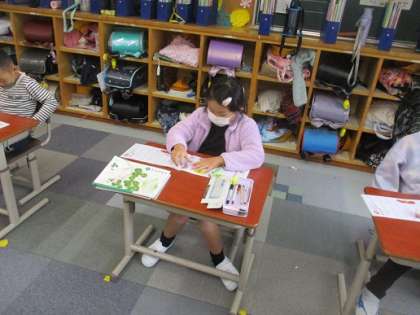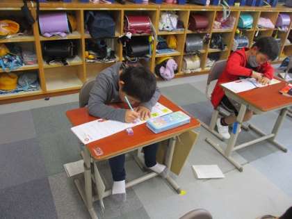 漢字の学習をしています。「本」「森」を書き順を確認しながら、丁寧にノートに書いています。みんな、とても上手に書けています。