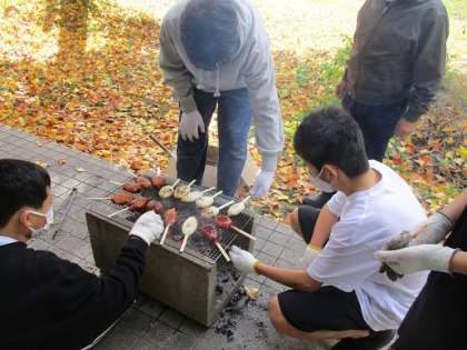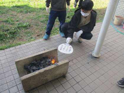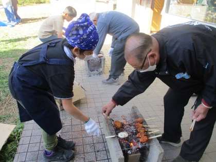 五平餅班の様子です。老人会の方に教えてもらいながら火起こしをしました。その後、たれをつけながら五平餅をどんどん焼いています。合計180本焼きました。香ばしい、とても良いにおいがしてきます。