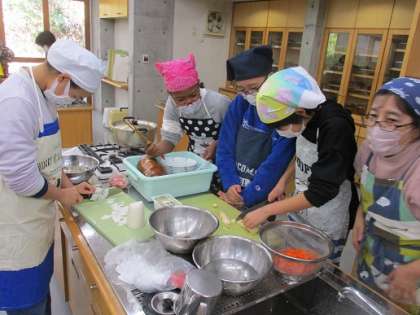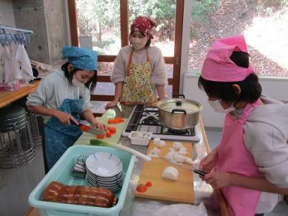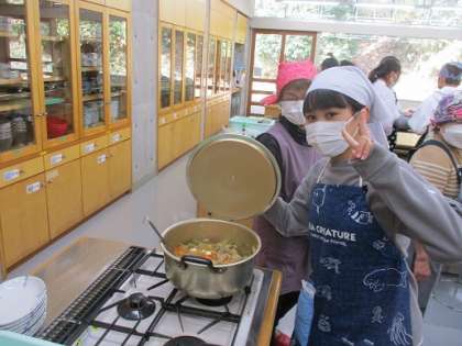 豚汁班の様子です。野菜を手際よく切っています。具たくさんの豚汁が完成しました。とてもおいしそうです。
