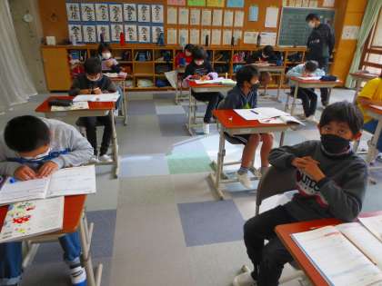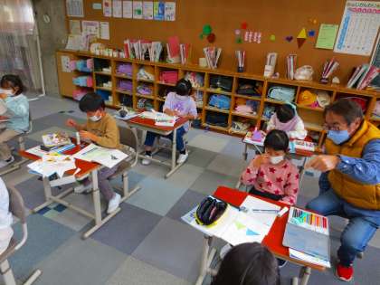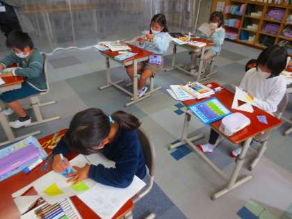 プリントされた図形に色を塗り、切り取ってノートに貼っています。