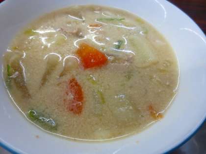 洋風だんご汁です。中にお団子が入っていて、白味噌とバターと牛乳がベースとなった深い味わいのお汁です。