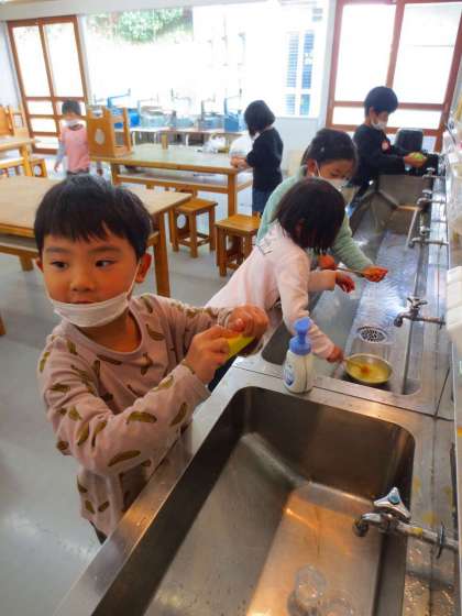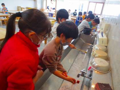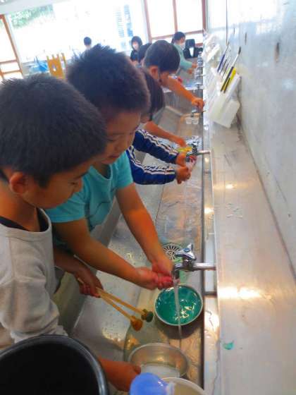 ちょっと作業終わりなってしまって、筆や手を洗っていました。みんな服に色がつかないように注意していて、成長したなと思いました。