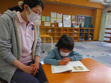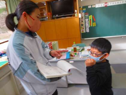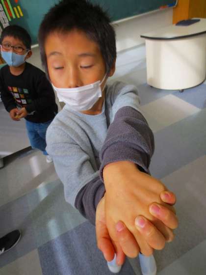 手のひらの中にもっているパーツの色を当てる遊びをしています。