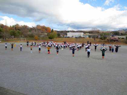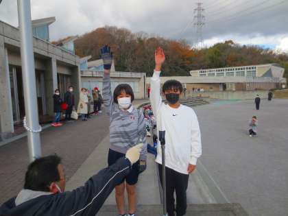 6年生男女の選手宣誓とラジオ体操で、持久走大会のスタートです。