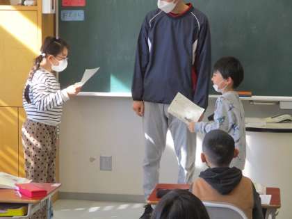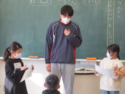 ねこちゃんを仲間外れにしようとするくまくんや、悲しむねこちゃんの姿を描いた絵をみて、いろいろな意見を発表しています。くまくんとねこちゃんが仲良くするために、どんな会話をすればいいかを考えて演じています。誰とでも仲良くするには、どうしたらよいかを考えることができました。