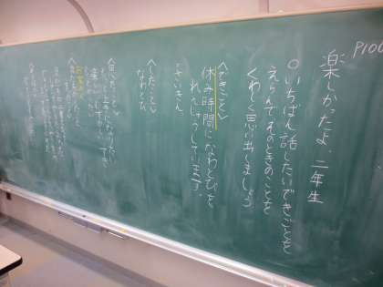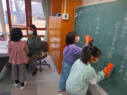 ちょうど放課です。黒板を消しているのは係の仕事ですね。
